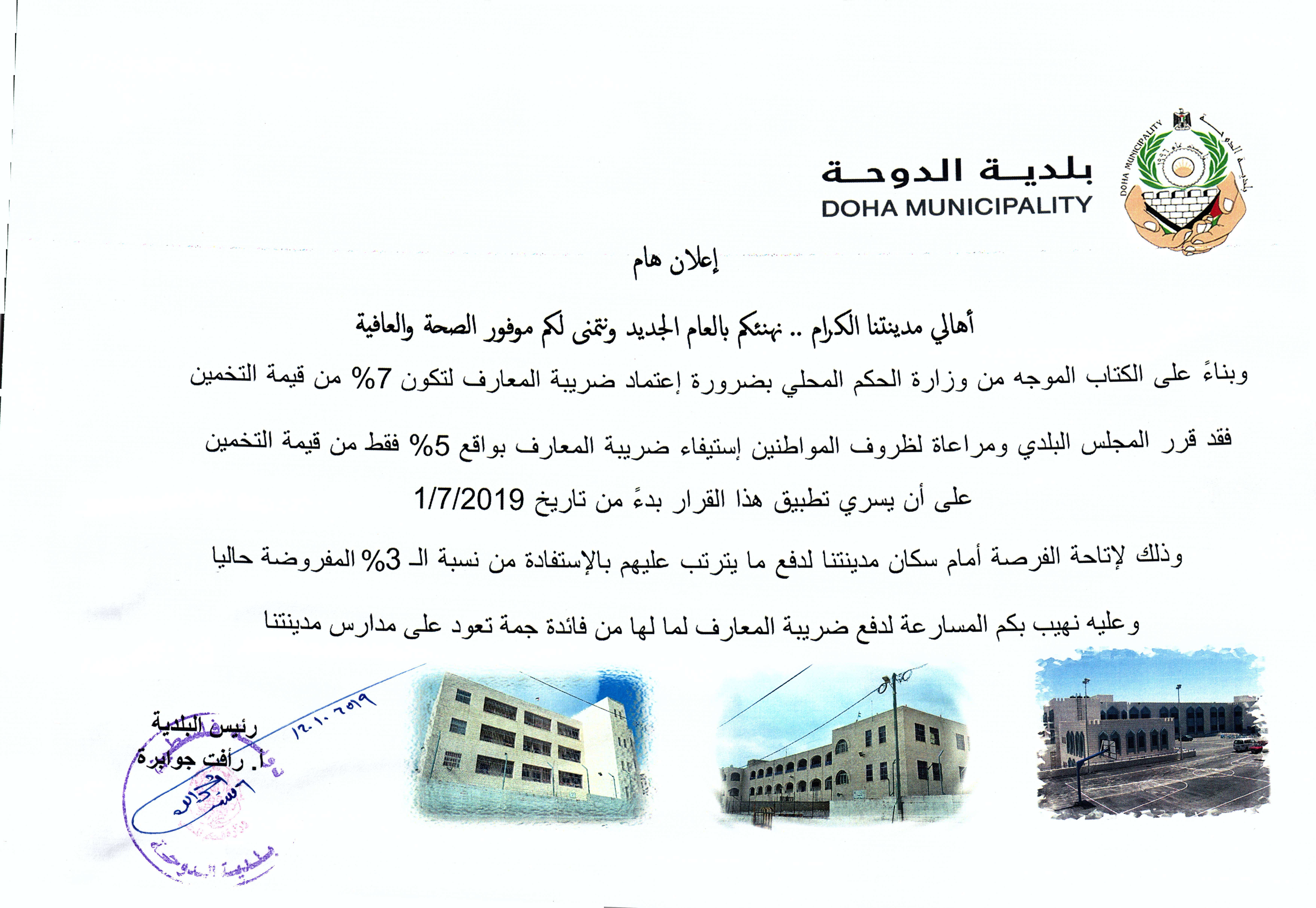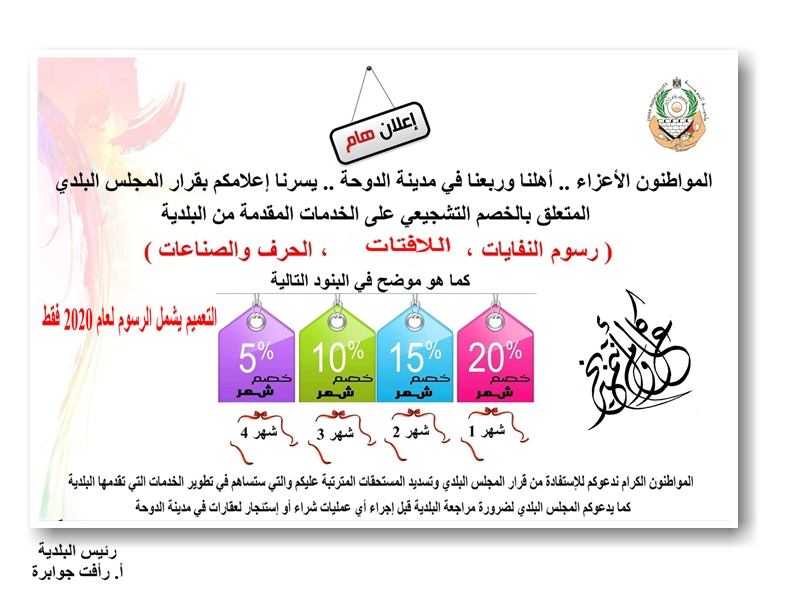 تشرين2 28, 12:26 pm الزيارات: 1964 كانون2 16, 13:50 pm الزيارات: 2278 كانون2 30, 12:50 pm الزيارات: 2062 حزيران 20, 09:33 am الزيارات: 1942 كانون2 12, 12:26 pm الزيارات: 2331 كانون2 28, 11:41 am الزيارات: 1898 نيسان 04, 09:33 am الزيارات: 2210 كانون2 12, 11:01 am الزيارات: 2435 السابق1234التالي Search الصفحة الرئيسية عن البلدية كلمة رئيس البلدية الهيكل التنظيمي دوائر البلدية الرسالة والاهداف الخطة الاستراتيجية خدماتنا مرافق البلدية مدينة الدوحـة أصل التسمية الموقع والمساحة خارطة مدينة الدوحة الإعـلام إعلانات البلدية الفعاليات البوم الصور الوسائط المتعددة إصداراتنـا إنجازاتنـا مجال التعليم خدمة المجتمع المحلي مشروع اعادة تأهيل حديقة البلدية المجال الرياضي مجال الصحة والبيئة العمل على تنفيذ مشاريع التوعية البيئية على مدار العام حملة مكافحة الكلاب الضالة مجال البنية التحتية وتأهيل الشوارع مجمل المشاريع التي تم انجازها في الفترات السابقة بيانات البلديـة إقتراحات وشكاوي التعريف بوحدة الشكاوي نموذج طلب الشكاوي إتصل بنا