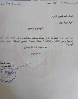التزامأ بقرار الحكومة تغلق البلدية ابوابها يومي الاثنين والثلاثاء بسبب جائحة كورونا