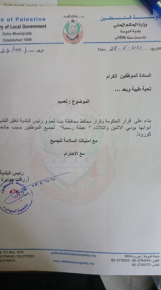 تعميم مواطنينا الكرامالتزامأ بقرار الحكومة تغلق البلدية ابوابها يومي الاثنين والثلاثاء بسبب جائحة كورونانتمنى السلامة للجميع حزيران 28, 12:17 pm الزيارات: 1748 السابق التالي