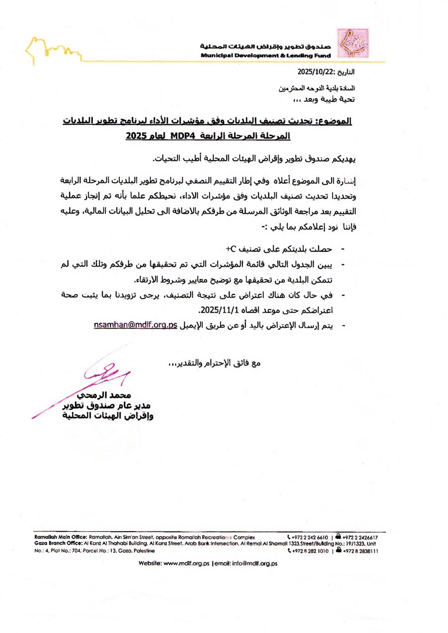 بلدية الدوحة تحصل على تصنيف +C ضمن برنامج تطوير البلديات (MDP4) لعام 2025